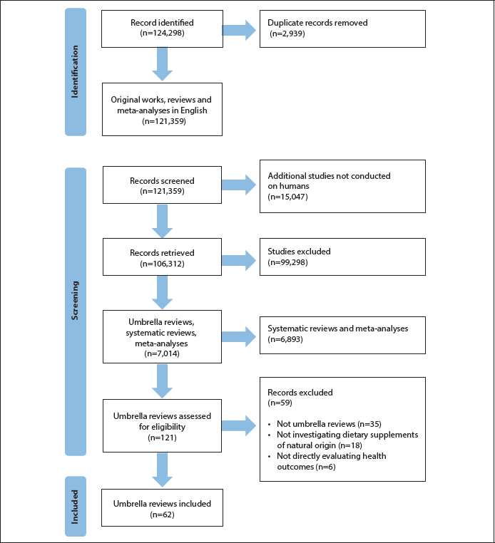 Dietary supplements (or food supplements) are defined by the US Food and Drug Administration (FDA) as “vitamins, minerals, herbs or other botanicals, amino acids or other dietary substances to be used to supplement the diet” [1], and by the Directive 2002/46/EC of the European Parliament and the Council as “concentrated sources of nutrients or other substances with a nutritional or physiological effect, alone or in combination, marketed in dose form (such as capsules, pastilles, tablets, pills and other similar forms, sachets of powder, ampoules of liquids, drop dispensing bottles, and other similar forms of liquids and powders) designed to be taken in measured small unit quantities” [2-4]. Although they have only been regulated for a few decades, the potential effects of minerals, vitamins, and botanicals on human health have been known since ancient times [5]. One of the earliest documents on “phytotherapy”, known as the Egyptian “Ebers papyrus”, dates to 2900 BC and includes more than 700 plant-based health remedies, such as onion, garlic, and pomegranate [6, 7]. In 2600 BC, an additional “list” of natural products with potential benefits for human health was represented in cuneiform on clay tablets by an unknown scholar from Mesopotamia [6]. A few centuries later, the Greeks and Romans used “medicinal herbs” to treat seasonal ailments, respiratory disorders, headaches, heartburn, and a wide plethora of “minor” conditions (e.g., wounds and burns) [6, 7]. The “cult” of natural products in the Middle Ages was preserved in the monasteries of Germany, England, France, and Ireland and was gradually enriched with Chinese, American and Indian herbs by the Arabs, Marco Polo and Vasco Da Gama [6, 7]. Until the isolation of alkaloids from pomegranate, ipecacuanha, and poppy in the early 19th century, which opened the new era of “medicinal chemistry”, the use of natural products remained the only remedy for the prevention and treatment of many diseases [5, 8]. However, the advent of pharmaceutical sciences did not spell the demise of phytotherapy. In fact, many drugs currently used in clinical practice are directly isolated from plants (e.g., paclitaxel and morphine) [9], and natural products are widely used as “alternative” medicines, although their efficacy is mainly based on traditional or folk use. In recent decades, the concept of “rational phytotherapy”, based on the identification and study of specific active components from plants, has been introduced [7], but this has led to a confusing scenario. Indeed, there is an impressive number of preclinical and clinical studies evaluating the pharmacological value of plant-derived compounds, but they are very heterogeneous in terms of animals/population selected, choice of intervention, dosage, follow-up period and results. The lack of rigorous studies on the ability of vitamins and minerals to maintain, support, or optimize physiological functions also represents a limitation. These supplements can correct deficiencies and contribute to general homeostasis (e.g., vitamin C for scurvy, vitamin D and calcium for bone metabolism, vitamin K for bleeding disorders) [2, 10]. However, over-the-counter products are often used by individuals without signs and symptoms of deficiency, especially in Europe and North America, despite the lack of conclusive evidence regarding their role in supporting physiological balance in such population [10-12]. Thus, there is a kind of “boilerplate” that does not allow us to understand the role of dietary supplements in the “real world” context. The aim of this systematic review of umbrella reviews is to summarize what is known and highlight what is missing regarding the health benefits of dietary supplements, to shed light on this controversial and debated field.