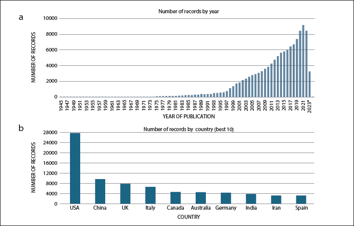 All the 121,360 identified records were also grouped by the country of publication of the study, which is intended as the authors’ affiliation declared country. In case of affiliations belonging to different countries in one paper, each country is counted as 1. The leading publishing country is USA, followed by China and UK (Figure 2b).