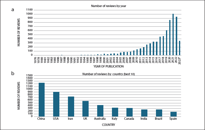 Figure 3. a) Number of non-duplicated systematic reviews and meta-analyses identified on Medline, by year of publication; b) number of non-duplicated systematic reviews and meta-analyses identified on Medline ranked by the best 10 countries of publication.