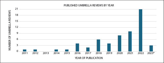 Figure 4. Number of published umbrella reviews investigating the effects of dietary supplements on human health outcomes by year of publication.