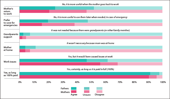 Among fathers who did not use paternity leave, most reported that they were not eligible. Other reasons included being unemployed, having unused vacation or leave time, or having paternity leave yet to be used. As for mothers, most of them declared that the fathers were not eligible. Other reasons included personal choice not to use the leave or the company not supporting use of leave, difficulties in utilisation or lack of information on how the fathers could use the paternity leave.