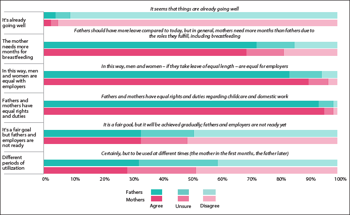 As for equal leave (in duration and pay), 28.3% of mothers and 32.2% of fathers agreed that the equal leave should be used at different times (mothers in the first few months, fathers later). Some mothers (33.0%) and fathers (32.9%) believed that equal leave is a fair goal but expressed concerns about fathers and employer’s readiness for such change. Furthermore, most fathers (72.4%) and mothers (69.0%) agreed that the father should have more leave, but, in general, that the mothers require longer leave than fathers due to the dyad specific needs, including breastfeeding (Figure 2).