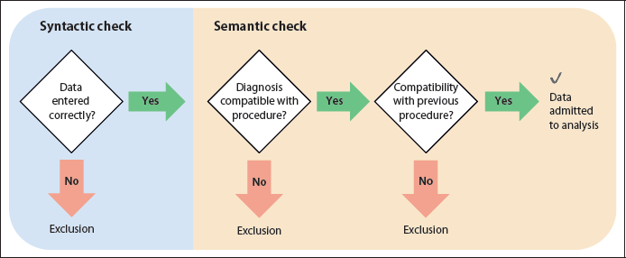 The study population consisted of all records stored in the RIAP database, related to hip and knee arthroplasties performed in years 2007-2021 that successfully passed a syntactic and semantic quality check [28] and that report the codes for type of intervention and cause of intervention listed in Table A1 and Table A2 available online as Supplementary Materials. The syntactic check admitted only those records whose values have been entered correctly (i.e., falling within the correct domain as described by RIAP record sets [24, 25]), while the semantic check ensured the compatibility of diagnoses with procedures and of each procedure type with previous procedures (Figure 1) [27].