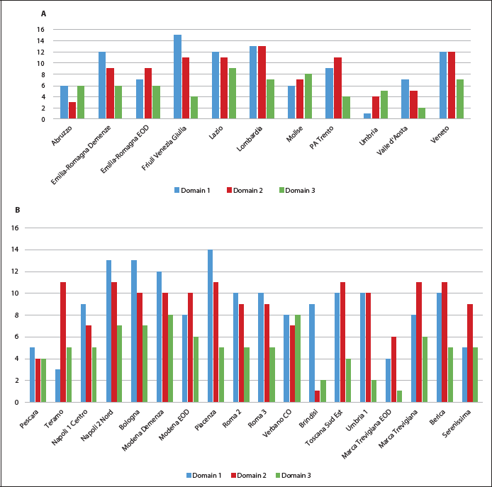 Figure 2. Score of each domain of the checklist for regional ICPs (panel A) and LHAs ICPs (panel B). ICPs: integrated care pathways; EOD: early onset dementia; LHA: Local Health Authority.