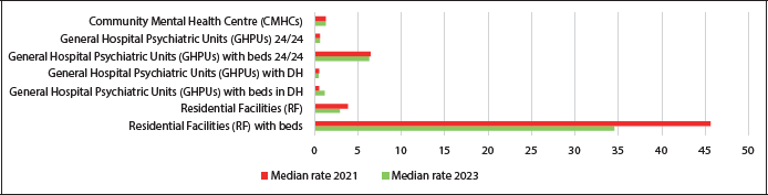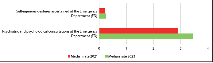 Regarding psychiatric and psychological consultations carried out by DMHs staff at the general hospital Emergency Department (ED) ( Figure 7 ), the median rate of consultations was 2.90 per 10,000 population in 2021 and 3.44 in 2023. Self-injurious gestures ascertained at the ED were 0.20 per 10,000 in 2021 and 0.26 in 2023.