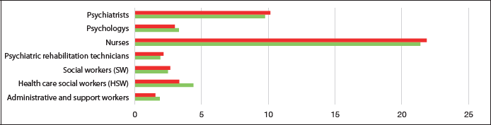 Psychiatric rehabilitation technicians and social workers reported median values of 2.13 per 100,000 inhabitants in 2021 to 1.91 in 2023 and 2.65 per 10,000 inhabitants in 2021 to 2.47 in 2023, respectively.