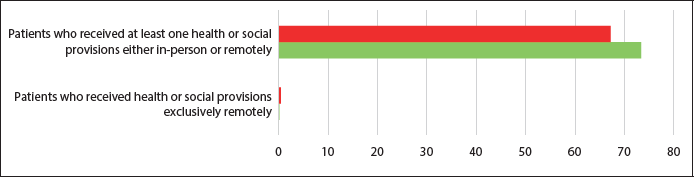 | Patients who received at least one health/social provisions either in-person or remotely | 67.20 | 73.40 | ↑ |