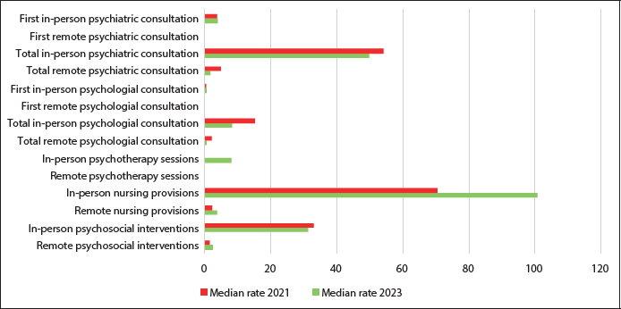The median rate of face-to-face provisions provided by DMHs (considering that a patient may receive more than one health and social provisions and considering the total number of psychiatric consults, psychological visits, nursing provisions and psychosocial interventions, excluding first visits) was 193.30 per 10,000 population in 2021 and 203.29 in 2023. Health and social provisions provided remotely decreased from a median of 16.70 per 10,000 population in 2021 to 8.72 in 2023 ( Figure 5 ).