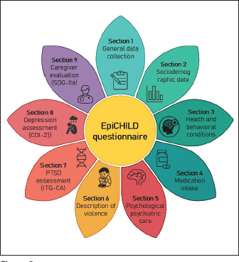 Figure 2. Schematic representation of the EpiCHILD questionnaire structure showing its nine thematic sections for assessing minors exposed to domestic violence and witnessed violence.